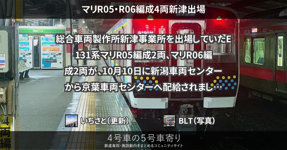 総合車両製作所新津事業所を出場していたE131系マリR05編成2両、マリR06編成2両が、10月10日に新潟車両センターから京葉車両センターへ配給されました。10日中に幕張車両センターへ回送されています。