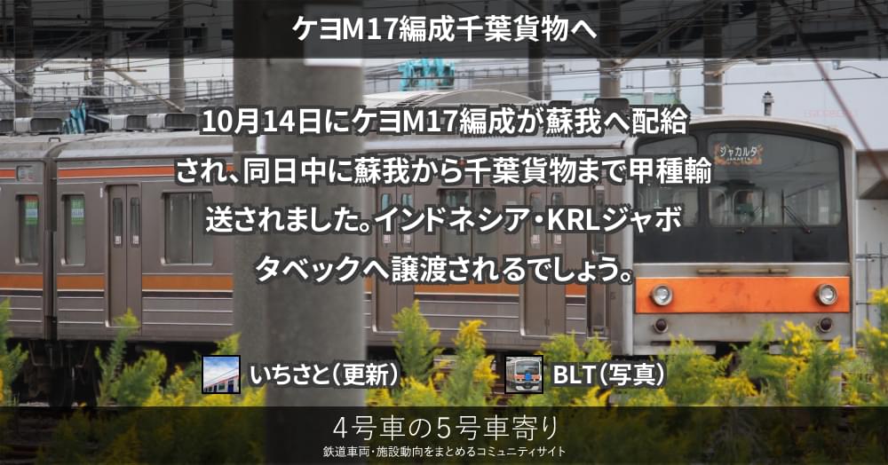 205系(東) ページ目次 ケヨM17編成千葉貨物へ 更新コンテンツ サイト投稿写真 2020/10/14 ケヨM17編成千葉貨物へ 10月14日にケヨM17編成が蘇我へ配給され、同日中に蘇我から千葉貨物まで甲種輸送されました。インドネシア・KRLジャボタベックへ譲渡されるでしょう。 更新コンテンツ 404 Not Found 上記コンテンツ傘下のページも含みます。 サイト投稿写真 BLT 撮影者サイト 紅葉をイメージした方向幕で配給を待つケヨM17編成。 BLT 撮影者サイト EF81 134の牽引で蘇我まで配給されるケヨM17編成。残る武蔵野線205系は1編成になりました。