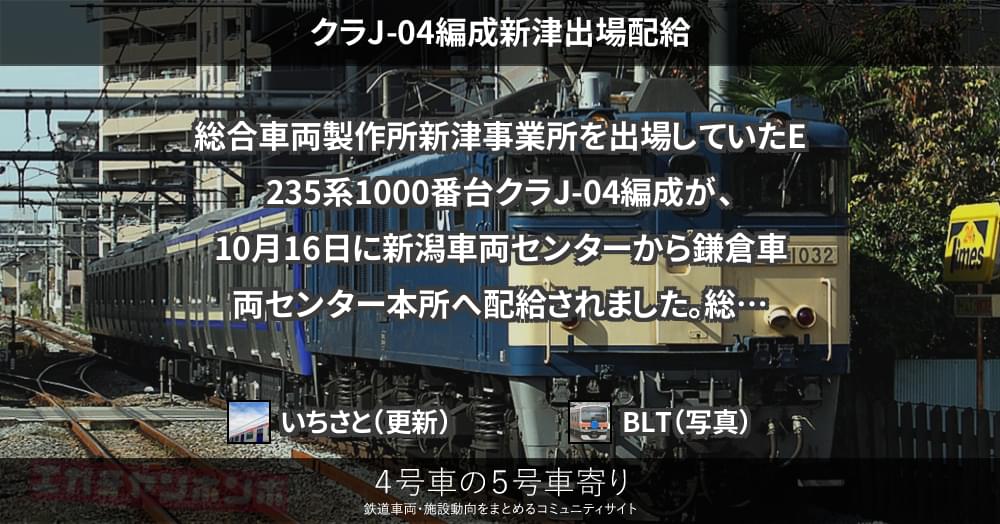 総合車両製作所新津事業所を出場していたE235系1000番台クラJ-04編成が、10月16日に新潟車両センターから鎌倉車両センター本所へ配給されました。