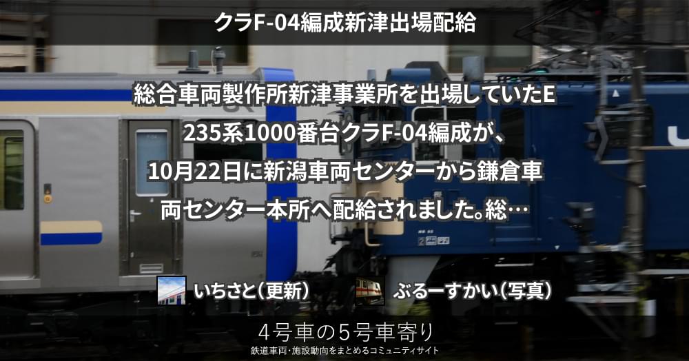 総合車両製作所新津事業所を出場していたE235系1000番台クラF-04編成が、10月22日に新潟車両センターから鎌倉車両センター本所へ配給されました。
