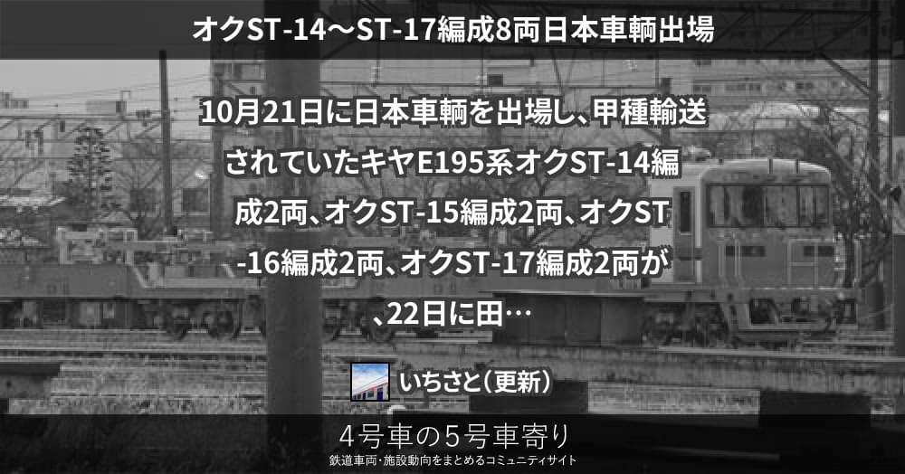 10月21日に日本車輌を出場し、甲種輸送されていたキヤE195系オクST-14編成2両、オクST-15編成2両、オクST-16編成2両、オクST-17編成2両が、22日に田端信号場へ到着しました。