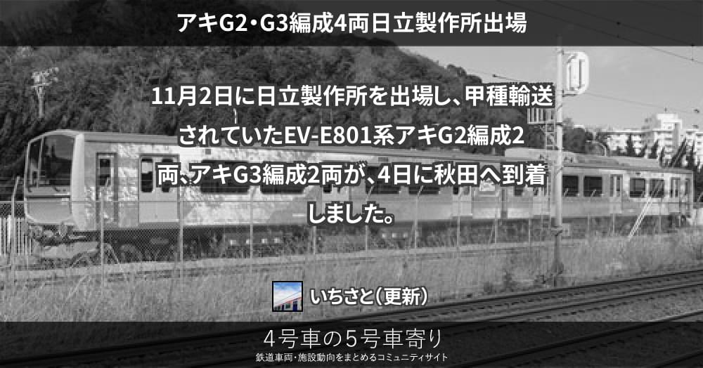 11月2日に日立製作所を出場し、甲種輸送されていたEV-E801系アキG2編成2両、アキG3編成2両が、4日に秋田へ到着しました。