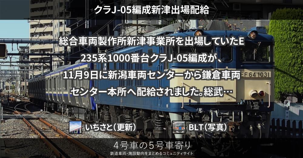 総合車両製作所新津事業所を出場していたE235系1000番台クラJ-05編成が、11月9日に新潟車両センターから鎌倉車両センター本所へ配給されました。
