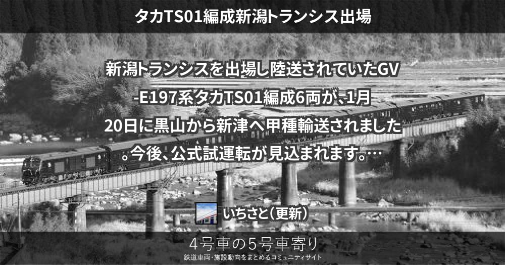 新潟トランシスを出場し陸送されていたGV-E197系タカTS01編成6両が、1月20日に黒山から新津へ甲種輸送されました。