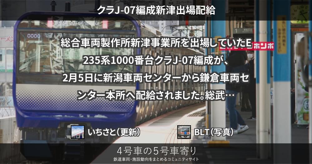 総合車両製作所新津事業所を出場していたE235系1000番台クラJ-07編成が、2月5日に新潟車両センターから鎌倉車両センター本所へ配給されました。