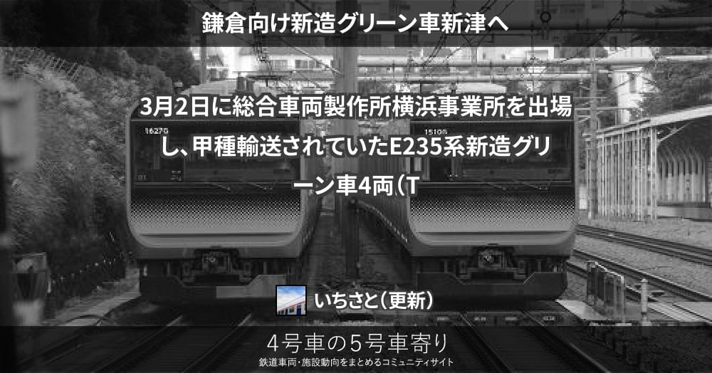 3月2日に総合車両製作所横浜事業所を出場し、甲種輸送されていたE235系新造グリーン車4両(TsdTsd'1010~1011)が、3日に新津へ到着しました。