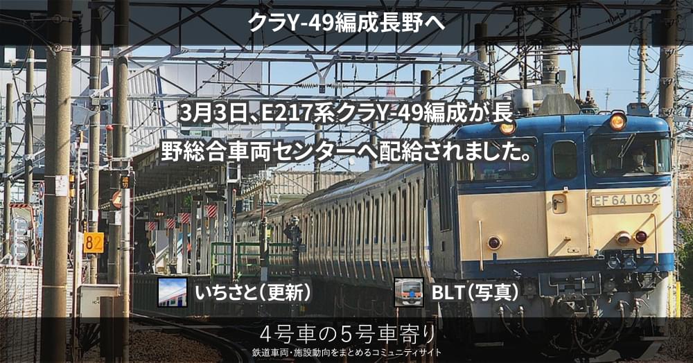 3月3日、E217系クラY-49編成が長野総合車両センターへ配給されました。