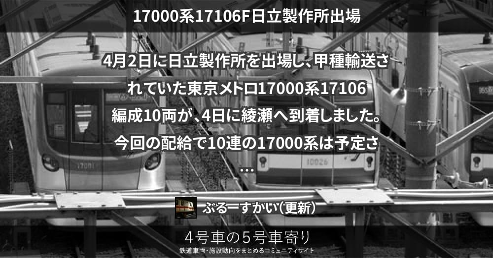 4月2日に日立製作所を出場し、甲種輸送されていた東京メトロ17000系17106編成10両が、4日に綾瀬へ到着しました。