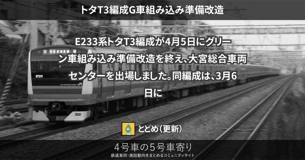 E233系トタT3編成が4月5日にグリーン車組み込み準備改造を終え、大宮総合車両センターを出場しました。