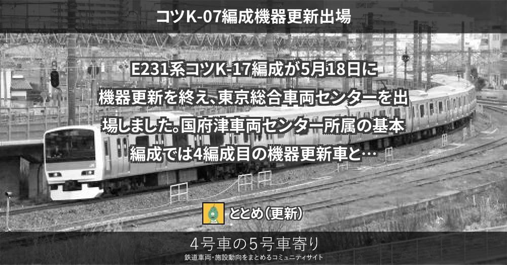 E231系コツK-17編成が5月18日に機器更新を終え、東京総合車両センターを出場しました。