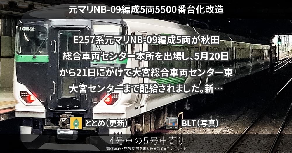 E257系元マリNB-09編成5両が秋田総合車両センター本所を出場し、5月20日から21日にかけて大宮総合車両センター東大宮センターまで配給されました。新オオOM-52編成です。