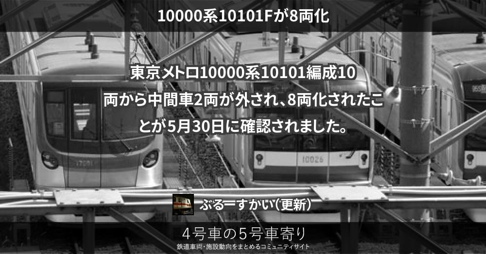 東京メトロ10000系10101編成10両から中間車2両が外され、8両化されたことが5月30日に確認されました。