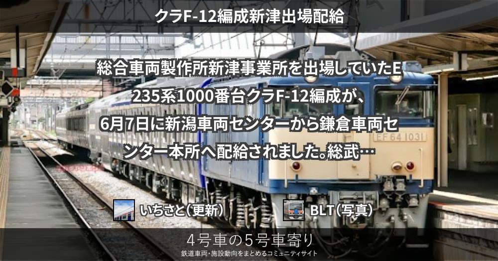 総合車両製作所新津事業所を出場していたE235系1000番台クラF-12編成が、6月7日に新潟車両センターから鎌倉車両センター本所へ配給されました。