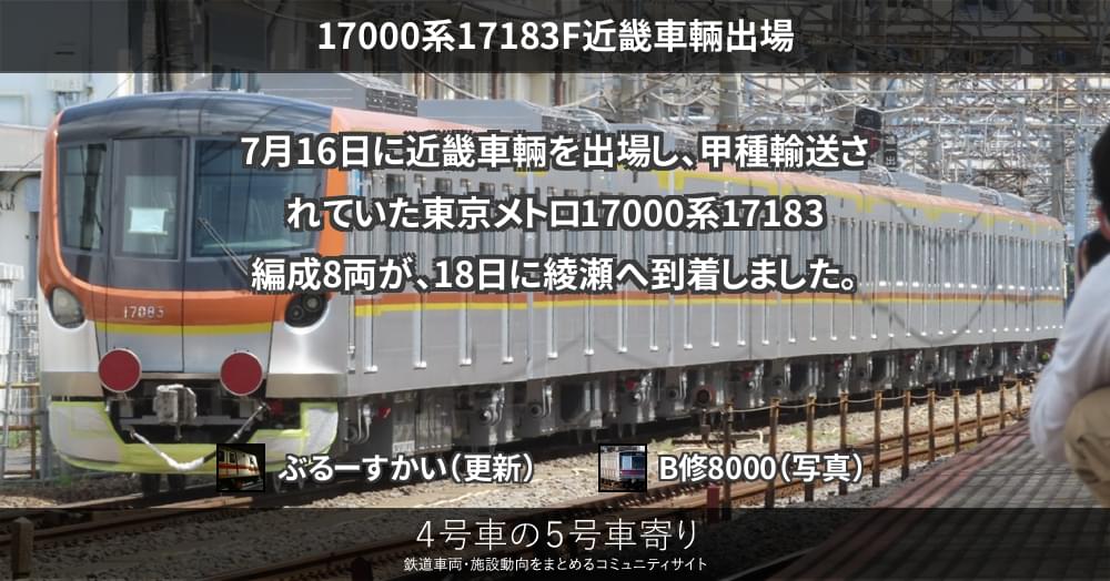 東京地下鉄17000系17183編成(8両)は16日午後に近畿車輛を出場し、現在徳庵から綾瀬へと甲種輸送されています。前例より、18日未明には綾瀬に到着するとみられます。によれば8連の17000系は今年度12本の導入予定です。#17日はとメ...
