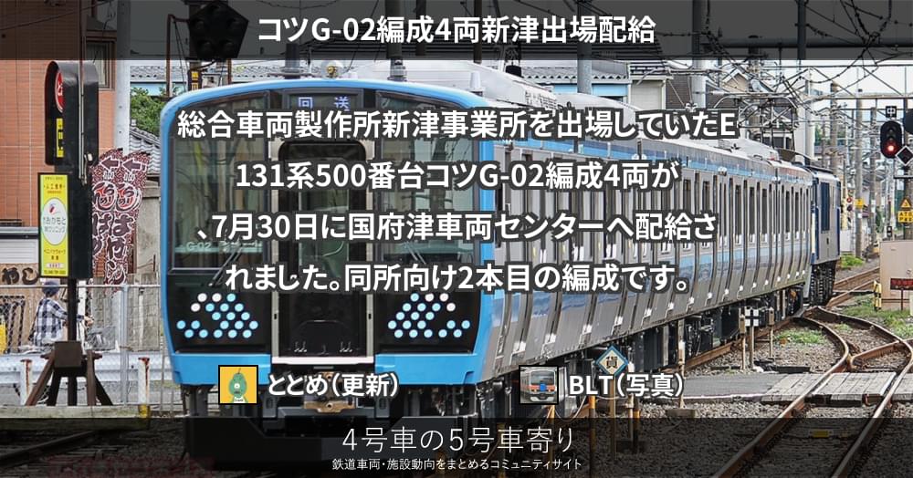 総合車両製作所新津事業所を出場していたE131系500番台コツG-02編成4両が、7月30日に国府津車両センターへ配給されました。