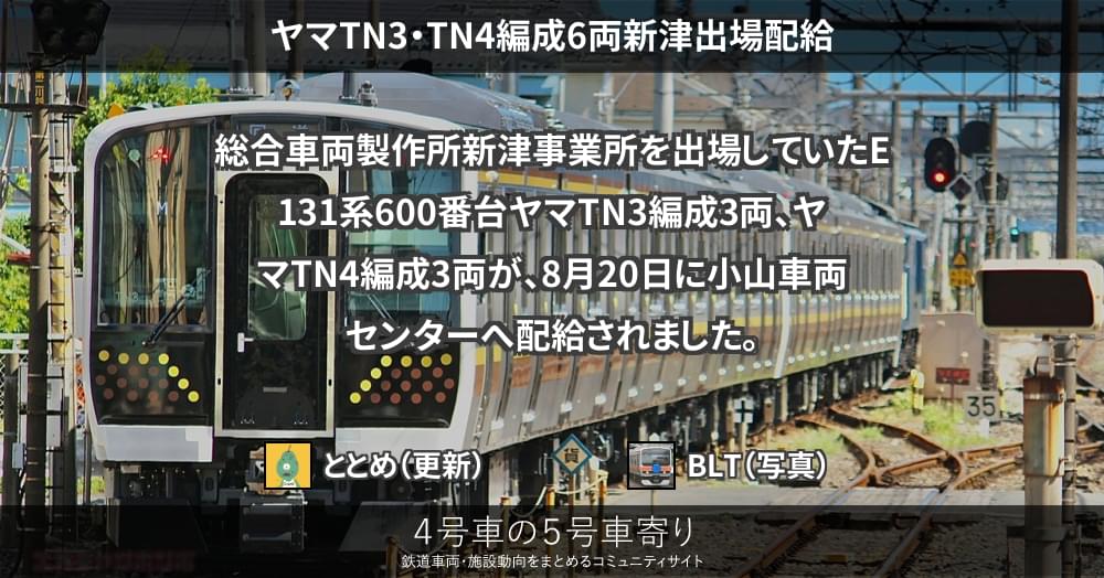 総合車両製作所新津事業所を出場していたE131系600番台ヤマTN3編成3両、ヤマTN4編成3両が、8月20日に小山車両センターへ配給されました。