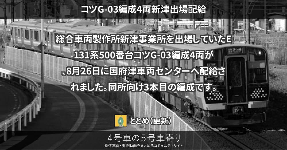 総合車両製作所新津事業所を出場していたE131系500番台コツG-03編成4両が、8月26日に国府津車両センターへ配給されました。