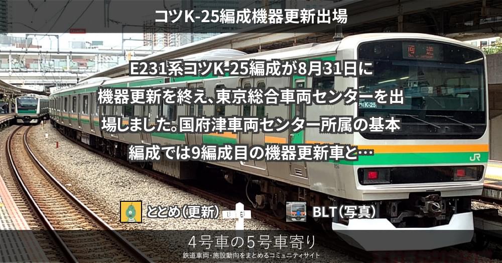 E231系コツK-25編成が8月31日に機器更新を終え、東京総合車両センターを出場しました。