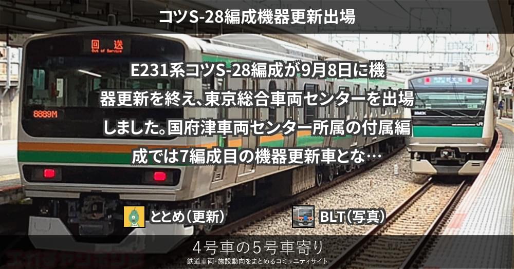 E231系コツS-28編成が9月8日に機器更新を終え、東京総合車両センターを出場しました。