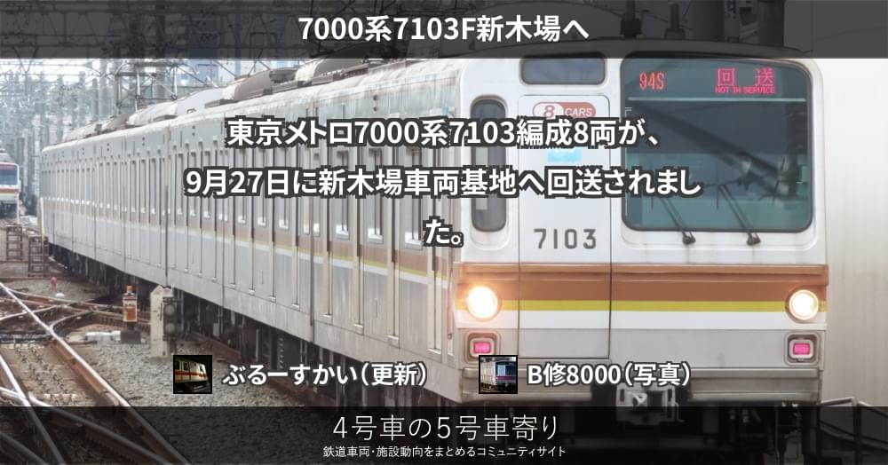 本日、東京メトロ7000系8両編成の7103Fが和光検車区から新木場車両基地へ不定期回送されました。運番が94Sで廃車回送と思われ、7000系8両編成5本目の運用離脱となります。最終運用は昨日の02Sでした。なお同編成が廃車となると、700...