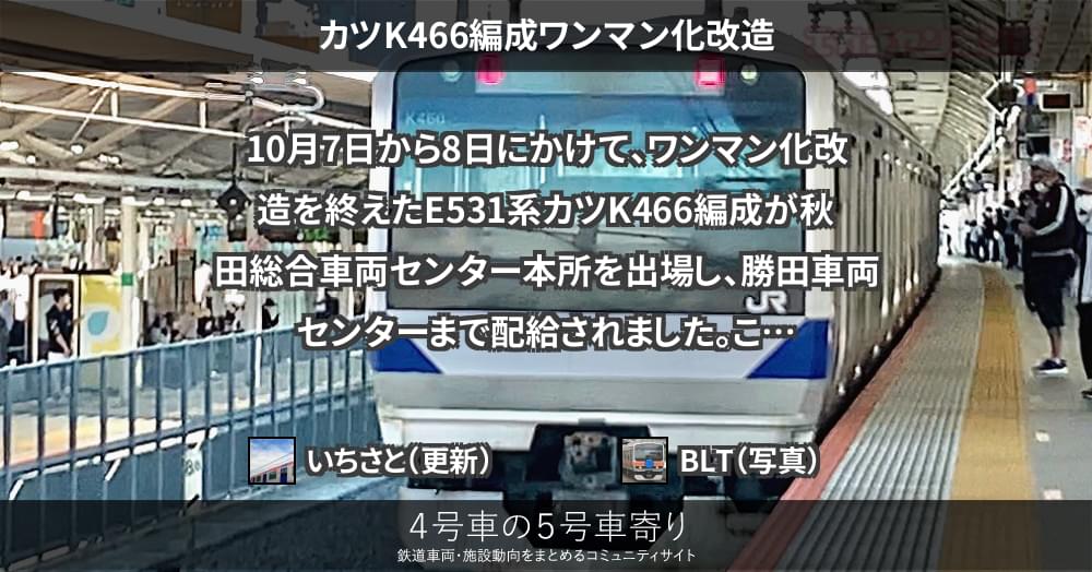 10月7日から8日にかけて、ワンマン化改造を終えたE531系カツK466編成が秋田総合車両センター本所を出場し、勝田車両センターまで配給されました。