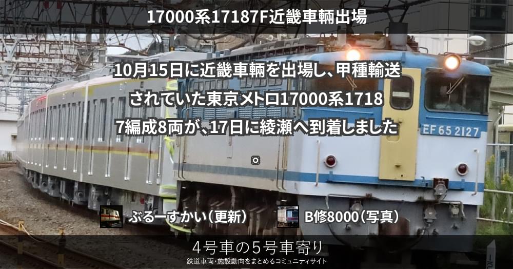 10月15日に近畿車輛を出場し、甲種輸送されていた東京メトロ17000系17187編成8両が、17日に綾瀬へ到着しました。