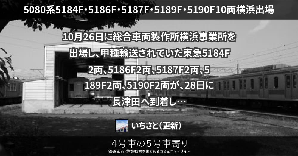 10月26日に総合車両製作所横浜事業所を出場し、甲種輸送されていた東急5184F2両、5186F2両、5187F2両、5189F2両、5190F2両が、28日に長津田へ到着しました。