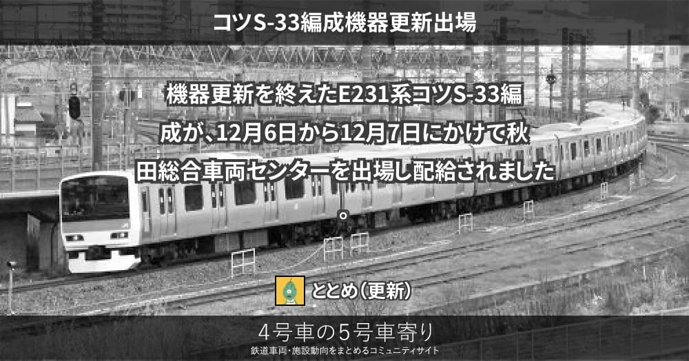 機器更新を終えたE231系コツS-33編成が、12月6日から12月7日にかけて秋田総合車両センターを出場し配給されました。