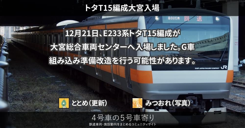12月21日、E233系トタT15編成が大宮総合車両センターへ入場しました。