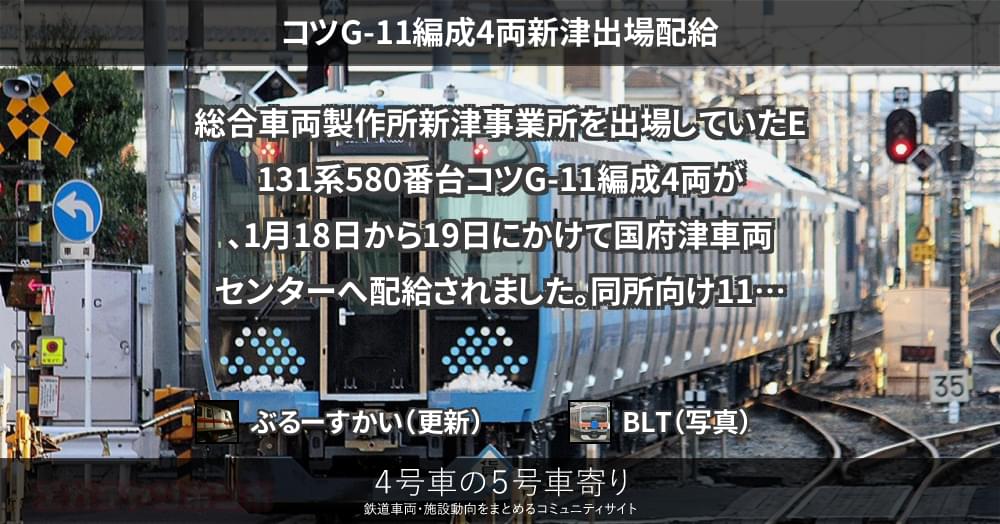 総合車両製作所新津事業所を出場していたE131系580番台コツG-11編成4両が、1月18日から19日にかけて国府津車両センターへ配給されました。