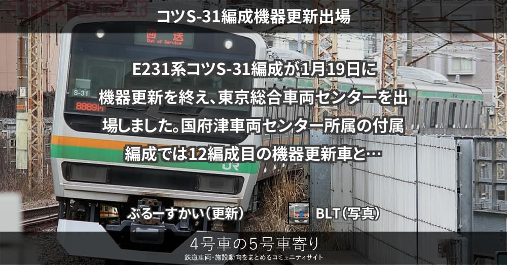 E231系コツS-31編成が1月19日に機器更新を終え、東京総合車両センターを出場しました。