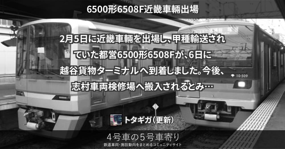 2月5日に近畿車輛を出場し、甲種輸送されていた都営6500形6508Fが、6日に越谷貨物ターミナルへ到着しました。