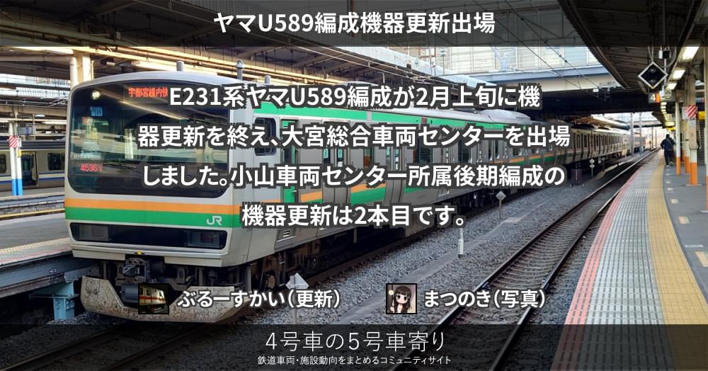 E231系ヤマU589編成が2月上旬に機器更新を終え、大宮総合車両センターを出場しました。