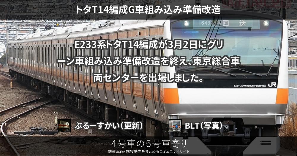 E233系トタT14編成が3月2日にグリーン車組み込み準備改造を終え、東京総合車両センターを出場しました。