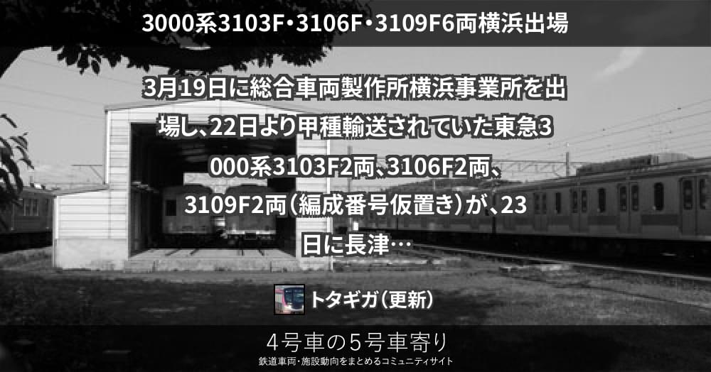 3月19日に総合車両製作所横浜事業所を出場し、22日より甲種輸送されていた東急3000系3103F2両、3106F2両、3109F2両(編成番号仮置き)が、23日に長津田へ到着しました。