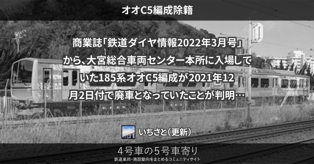 商業誌「鉄道ダイヤ情報2022年3月号」から、大宮総合車両センター本所に入場していた185系オオC5編成が2021年12月2日付で廃車となっていたことが判明しました。