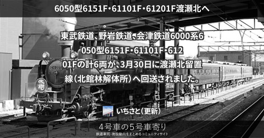 東武鉄道、野岩鉄道、会津鉄道6000系6050型6151F・61101F・61201Fの計6両が、3月30日に渡瀬北留置線(北館林解体所)へ回送されました。