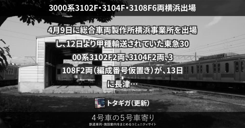 4月9日に総合車両製作所横浜事業所を出場し、12日より甲種輸送されていた東急3000系3102F2両、3104F2両、3108F2両(編成番号仮置き)が、13日に長津田へ到着しました。