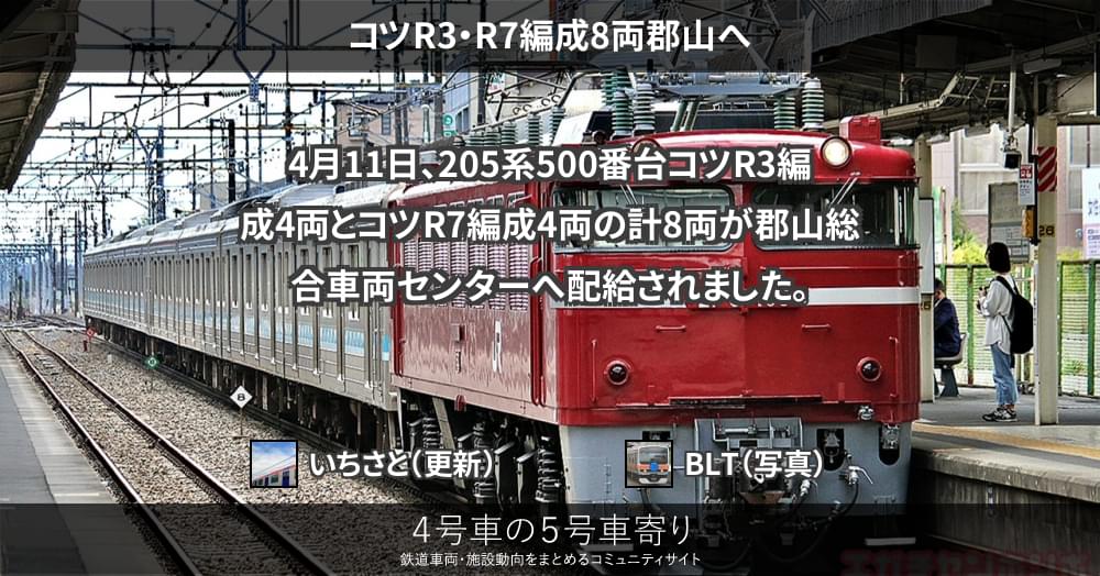 4月11日、205系500番台コツR3編成4両とコツR7編成4両の計8両が郡山総合車両センターへ配給されました。