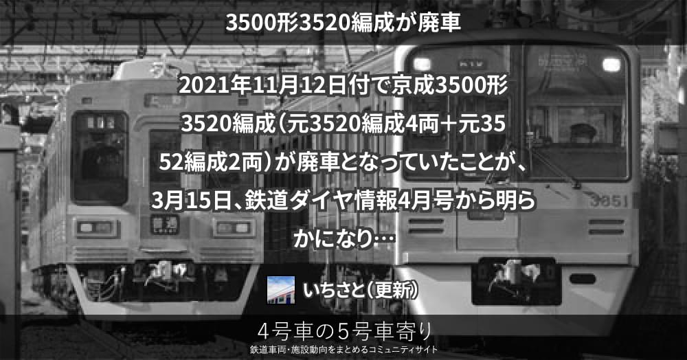 2021年11月12日付で京成3500形3520編成(元3520編成4両+元3552編成2両)が廃車となっていたことが、3月15日、鉄道ダイヤ情報4月号から明らかになりました。