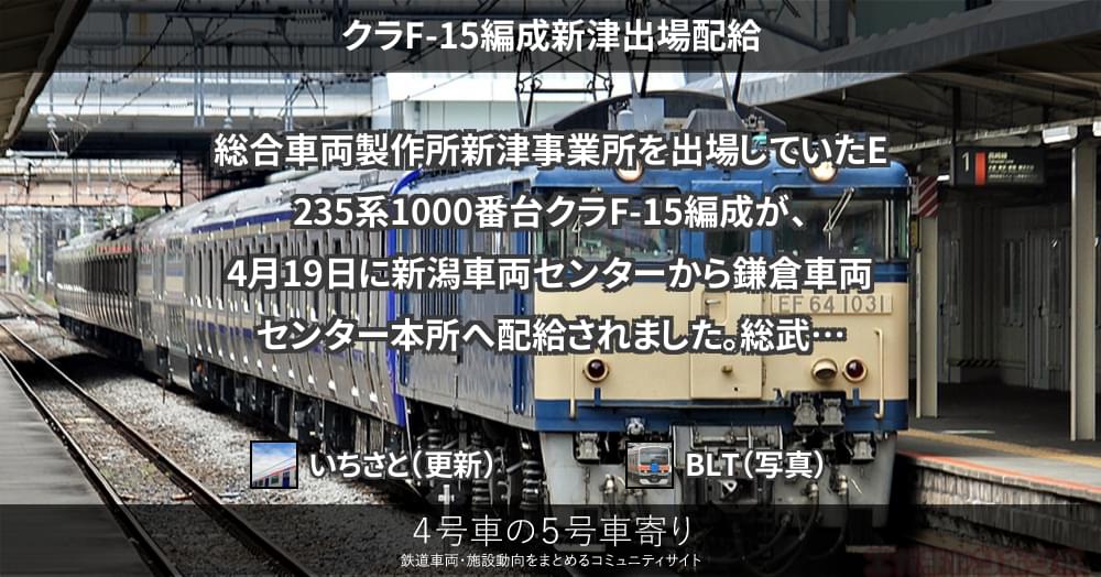 総合車両製作所新津事業所を出場していたE235系1000番台クラF-15編成が、4月19日に新潟車両センターから鎌倉車両センター本所へ配給されました。