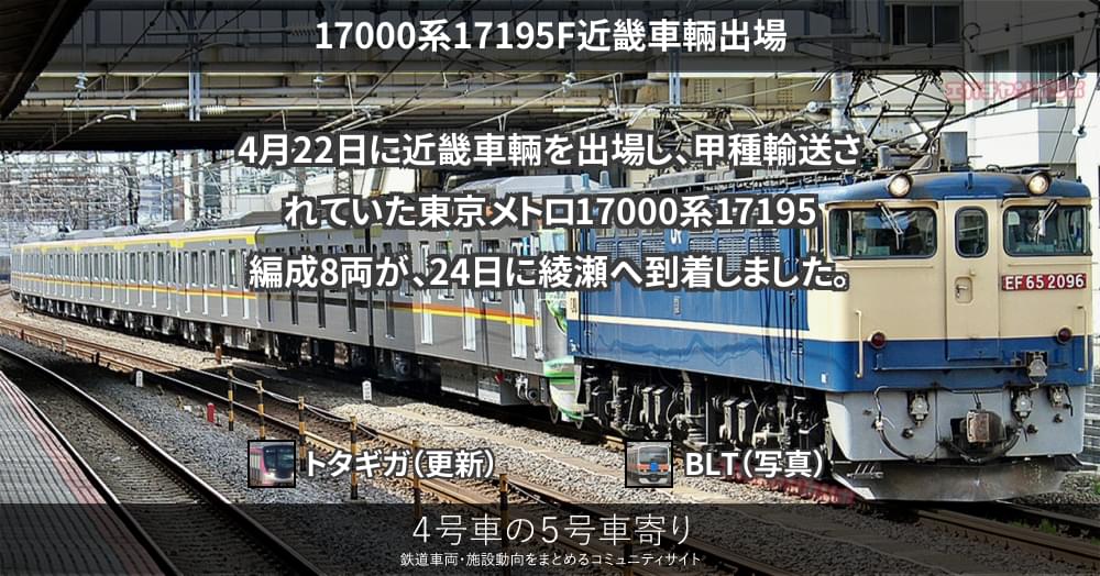 本日、東京メトロ17000系17195Fが近畿車輛を出場し、甲種輸送が行われています。これにて、2020年1月より始まった17000系の増備に、終止符を打つことになります。なお、置き換え予定の7000系はをもって全編成が本線から撤退済みです...