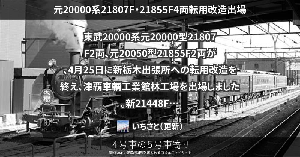 東武20000系元20000型21807F2両、元20050型21855F2両が、4月25日に新栃木出張所への転用改造を終え、津覇車輌工業館林工場を出場しました。新21448Fです。