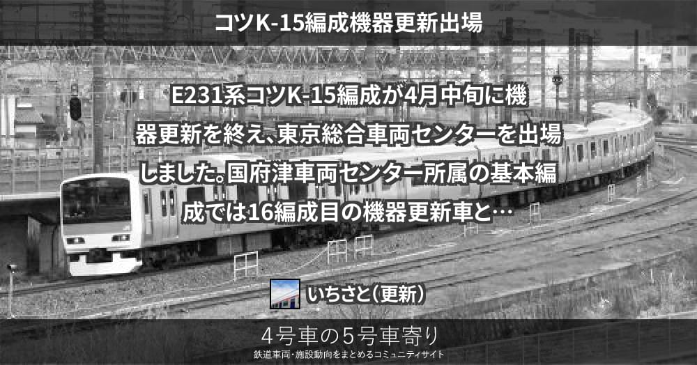 E231系コツK-15編成が4月中旬に機器更新を終え、東京総合車両センターを出場しました。