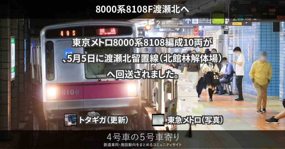 本日、東京メトロ8000系8108Fが鷺沼検車区から半蔵門線・東武スカイツリーライン経由で北館林荷扱所へ臨時回送されました。運番(49S)や前例より8000系4編成目の運用離脱となり、今後は廃車されるものと思われます。同編成の最終検査は20...