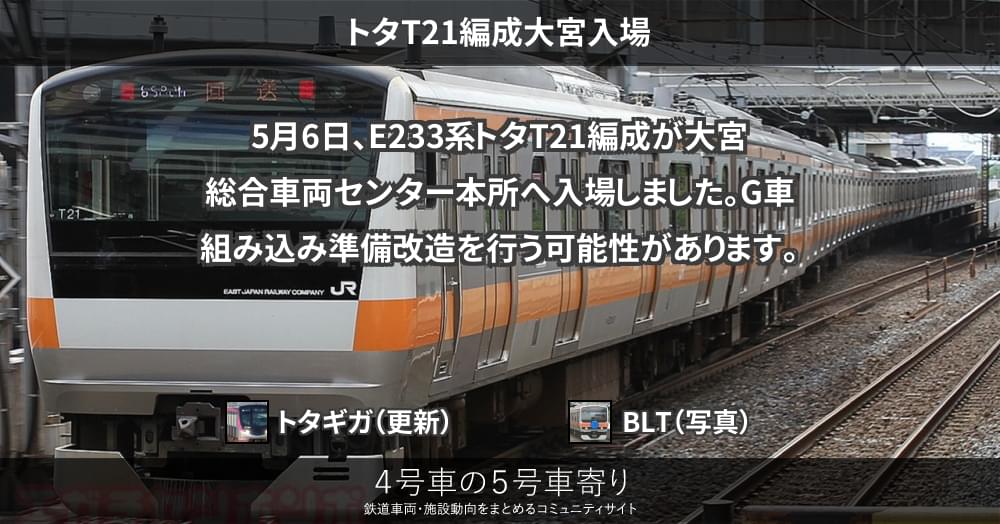 5月6日、E233系トタT21編成が大宮総合車両センター本所へ入場しました。