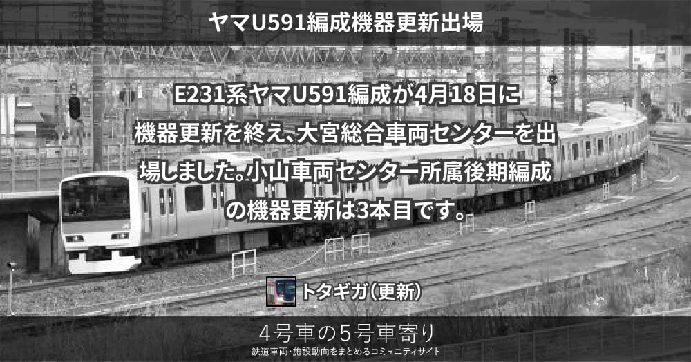 E231系ヤマU591編成が4月18日に機器更新を終え、大宮総合車両センターを出場しました。