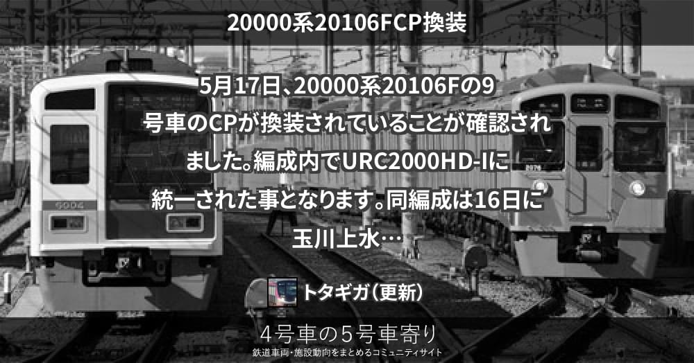 5月17日、20000系20106Fの9号車のCPが換装されていることが確認されました。編成内でURC2000HD-Iに統一された事となります。