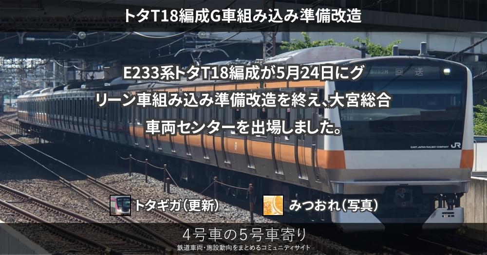 E233系トタT18編成が5月24日にグリーン車組み込み準備改造を終え、大宮総合車両センターを出場しました。