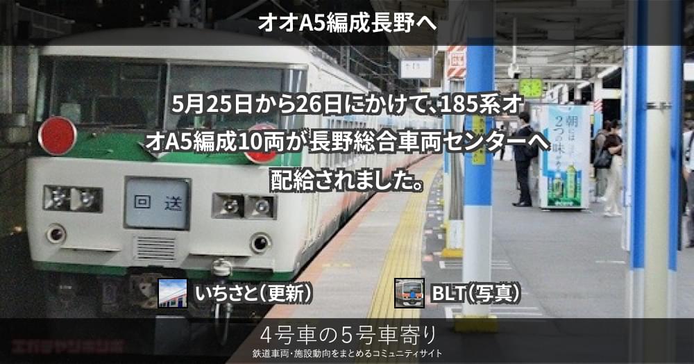 JRの車両その他(東) ページ目次 オオA5編成長野へ 更新コンテンツ サイト投稿写真 2022/05/26 オオA5編成長野へ 5月25日から26日にかけて、185系オオA5編成10両が長野総合車両センターへ配給されました。 オオA5編成配給本日、185系オオA5編成が大宮総合車両センター東大宮センターから長野方面へ配給輸送されています。牽引はEF64 1031です。廃車のため長野総合車両センター(工場:NN)へ入場と推測されます。 更新コンテンツ 404 Not Found 上記コンテンツ傘下のページも含みます。 サイト投稿写真 BLT 撮影者サイト C7編成以来の配給となる185系。 BLT 撮影者サイト 牽引はEF64 1031。